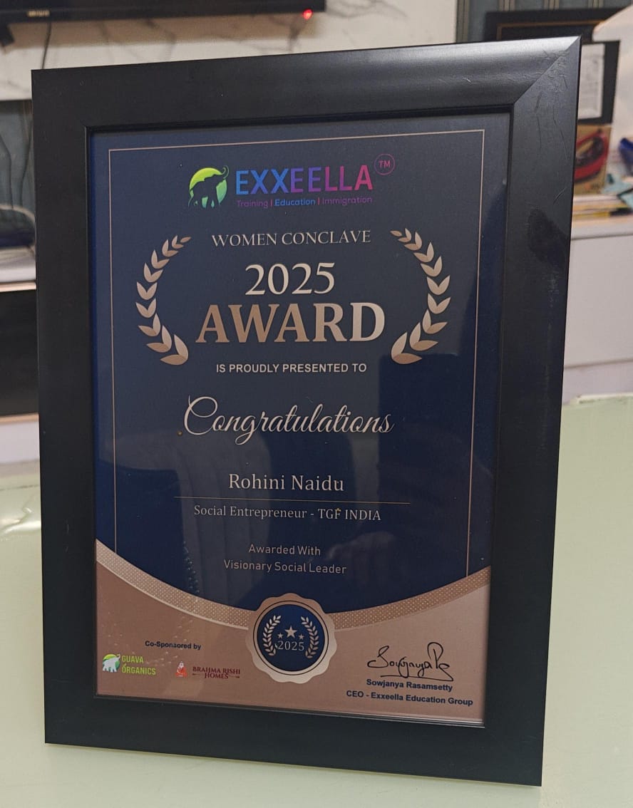 We are overjoyed and proud to announce that our very own Rohini Naidu, Founder and Social Entrepreneur of The Girl Foundation (TGF India), has been honored with the Visionary Social Leader Award at the prestigious Women Conclave 2025, organized by Exxeella Education Group.